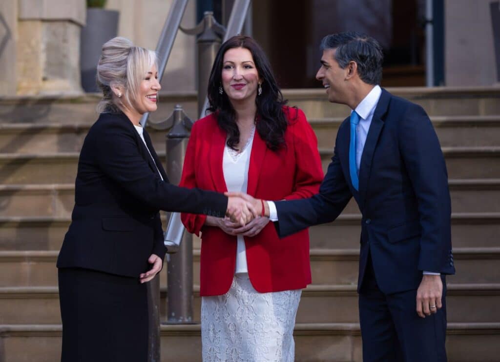De izda. a dcha., Michelle O’Neill, Emma Little-Pengelly y el primer ministro británico Rishi Sunak en Belfast, 5-02-2024 (CC Simon Walker/No. 10 Downing Street)